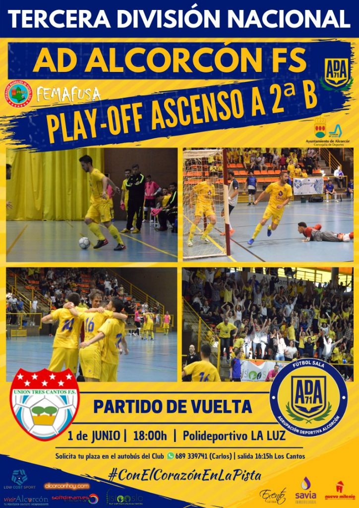 El primer equipo masculino del AD Alcorcón Fútbol Sala estará tremendamente arropado este sábado en el pabellón La Luz de Tres Cantos, donde a partir de las 18.00 horas disputa el partido de vuelta del playoff de ascenso a Segunda división B ante el Unión tres Cantos.