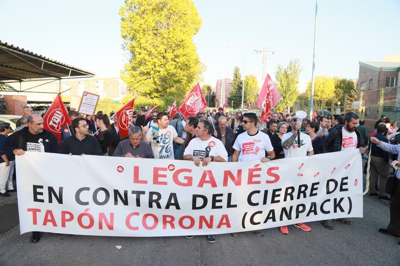 Más de un centenar de personas acudieron a la manifestación convocada por los trabajadores de la factoría de Tapón Spain en Leganés para protestar por la decisión de la empresa Can-Pack de cesar la actividad productiva en esta planta. Su cierre llevaría implícito el despido de los 46 empleados de la factoría.