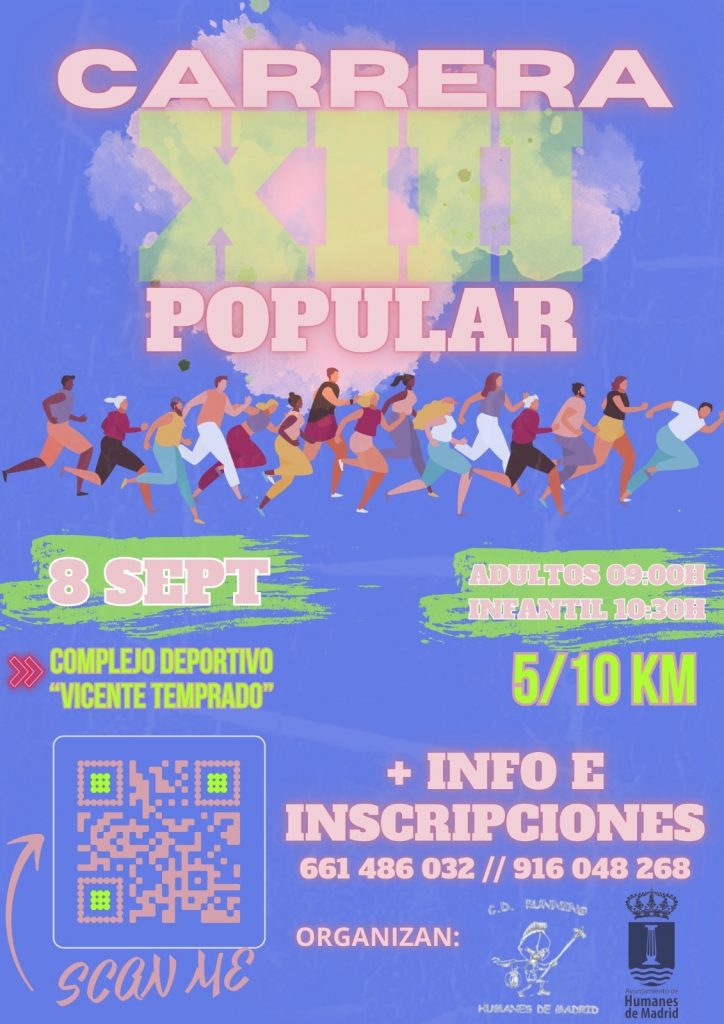 El CD Running Humanes de Madrid, en colaboración con la Concejalía de Deportes, organizará el domingo 8 de septiembre la 13ª edición de la Carrera Popular Humanes de Madrid, que se desarrollará sobre un circuito de 5 km con un recorrido circular de asfalto y tierra, dándose dos vueltas a dicho trazado.