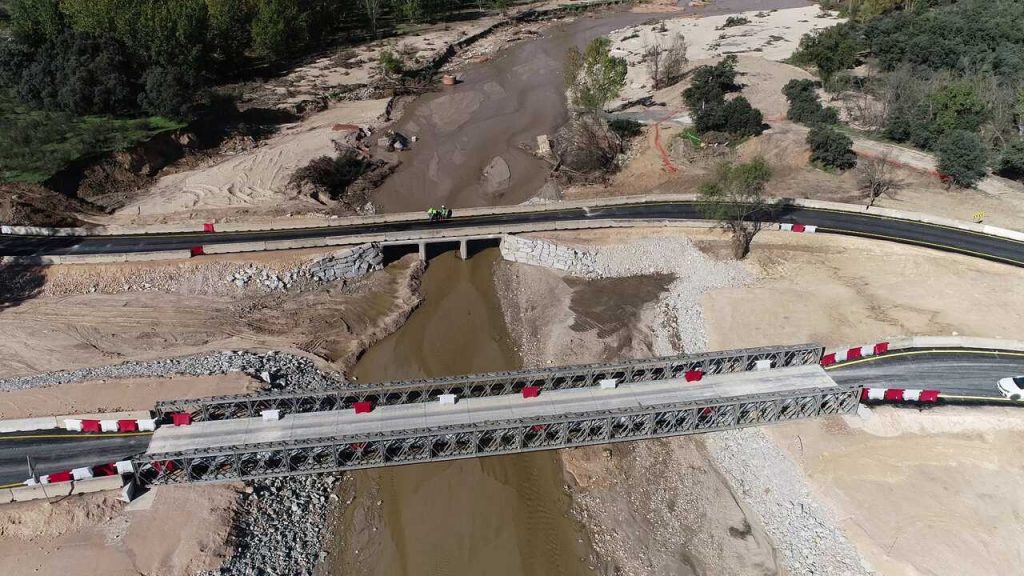 El puente ‘Mabey’, de 49 metros, soporta hasta 40 toneladas, cuenta con un ancho de calzada de 4,20 metros y es de un único sentido. Para su tendido -cuyos trabajos comenzaron el 12 de octubre- realizado por personal del Regimiento de Especialidades de Ingenieros número 11 (REI-11), ha sido necesario realizar un elevado volumen de trabajos iniciales de acondicionamiento y preparación de las orillas y de acceso a la carretera, así como la construcción de unas losas de hormigón para colocar los dos estribos del puente, realizados por Sacyr.