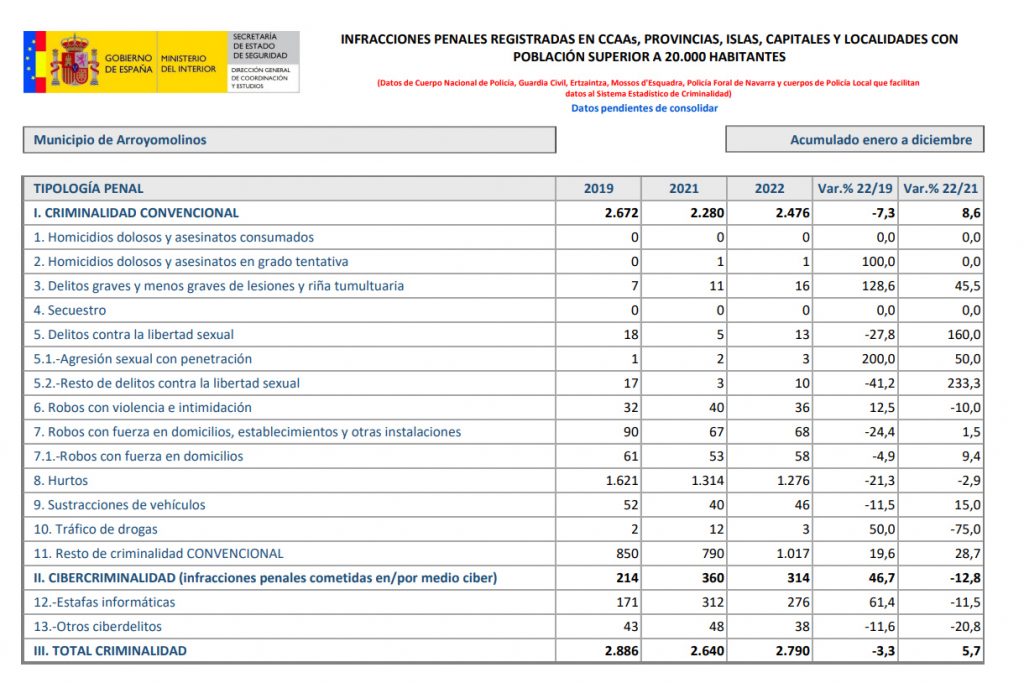 Un contexto que se repite en municipios como Arroyomolinos, donde la delincuencia ha bajado en cuatro años, pero ha repuntado de forma sustancial en el 2022.
