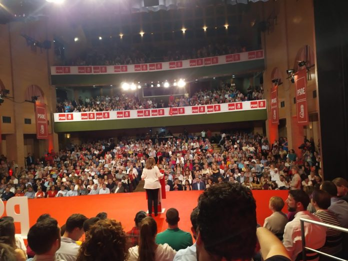 Multitudinario acto de precampaña electoral de Pedro Sánchez en el Teatro Buero Vallejo. El presidente de España en funciones y candidato del PSOE elogió la figura de la alcaldesa de Alcorcón, Natalia de Andrés, durante su intervención en el mitin.