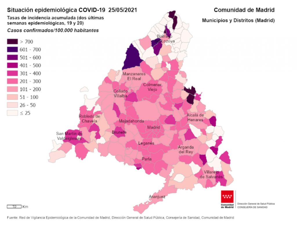 Es el caso de Alcorcón, donde a 25 de mayo, la IA a 14 días está por debajo de los 200 casos. Concretamente en 174 contagios por 100.000 habitantes. Incluso la zona básica de salud de Parque Oeste presenta una incidencia de 81 casos por 100.000 habitantes a 14 días.