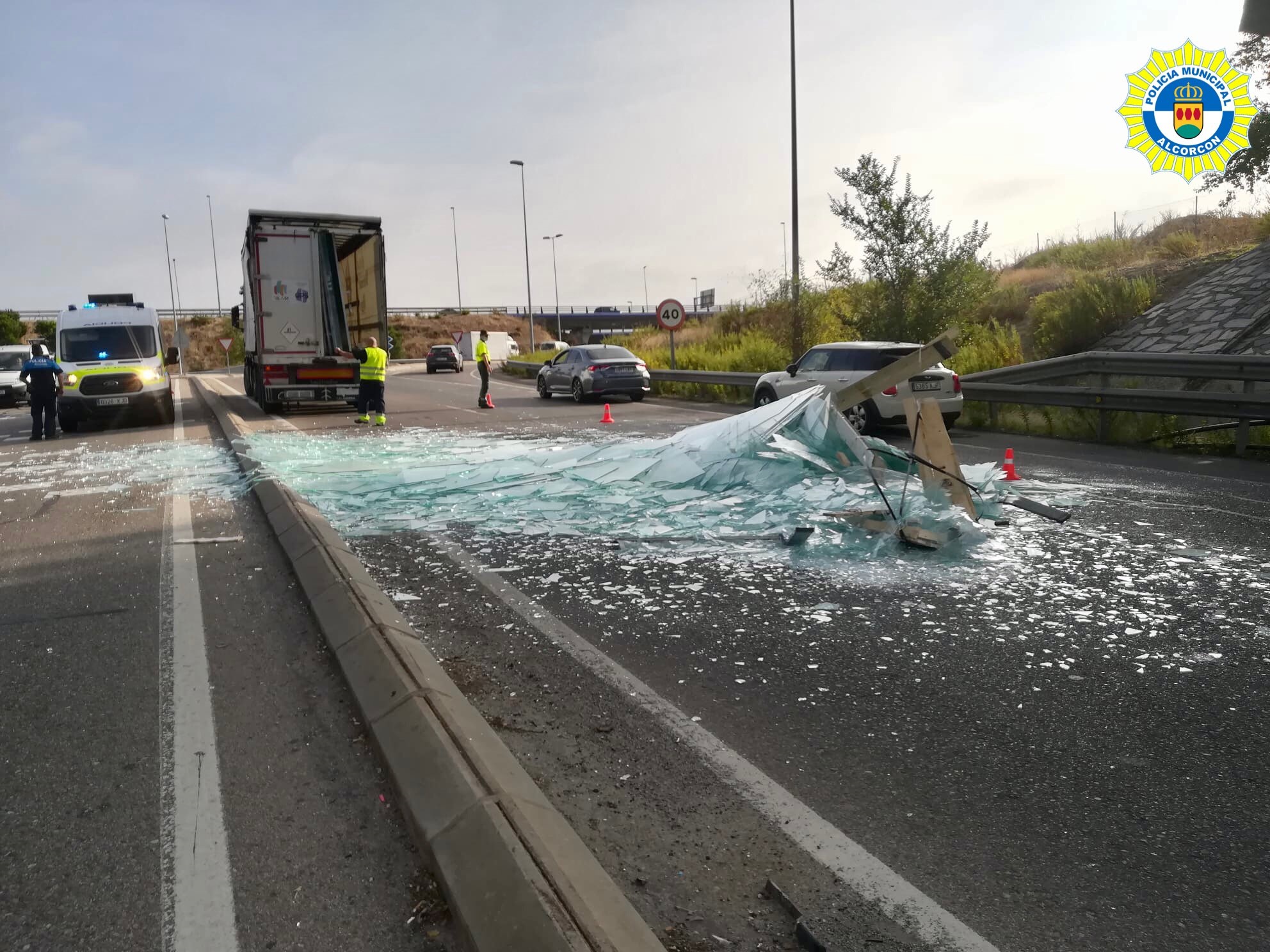 Un tramo de carretera que une la M-506 con la M-50 a su paso por Alcorcón ha tenido que ser cortado al tráfico a consecuencia de la gran acumulación de cristales sobre la calzada tras el accidente sufrido por un camión, que como consecuencia del suceso ha visto como su carga de cristal caía sobre el asfalto imposibilitando la circulación.