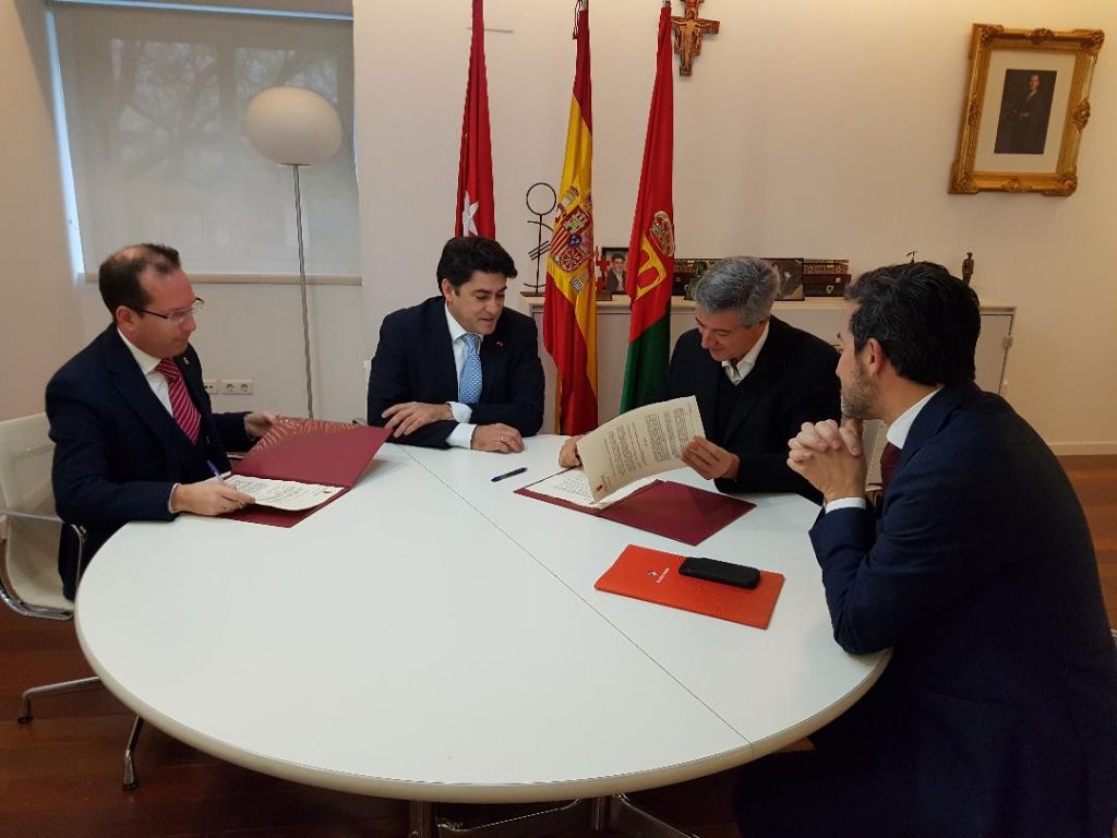 El alcalde de Alcorcón, David Pérez, y el consejero delegado del Atlético de Madrid, Miguel Ángel Gil Marín, acompañados por el concejal Luis Galindo y el director de la Academia del club rojiblanco, Emilio Gutiérrez, han procedido este viernes a la firma de la concesión administrativa de tres parcelas en el municipio alcorconero para la construcción de la Academia del Fútbol de la entidad rojiblanca en la zona sur madrileña. La inversión del Atlético de Madrid será de doce millones de euros y el inicio de las obras está previsto para la próxima primavera.