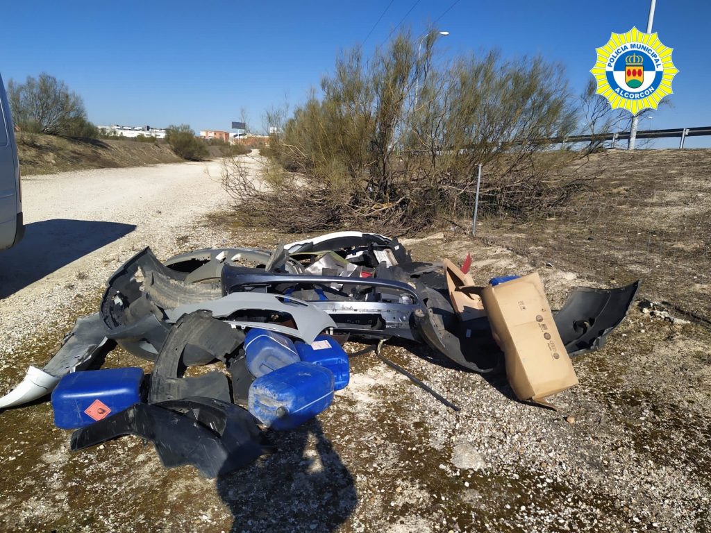 La Policía Municipal de Alcorcón ha multado a un taller de vehículos de la ciudad, como presunto responsable de diversos vertidos ilegales en la calle Vereda de los Barros, donde se encontraban restos de un turismo y otros objetos potencialmente contaminantes.