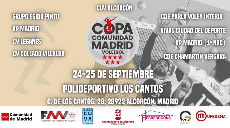 El Polideportivo de Los Cantos (Alcorcón) será el escenario en el que los 9 equipos que participan en la Copa CAM Senior Masculina de Voleibol se verán las caras durante este próximo fin de semana (24 y 25 de septiembre).