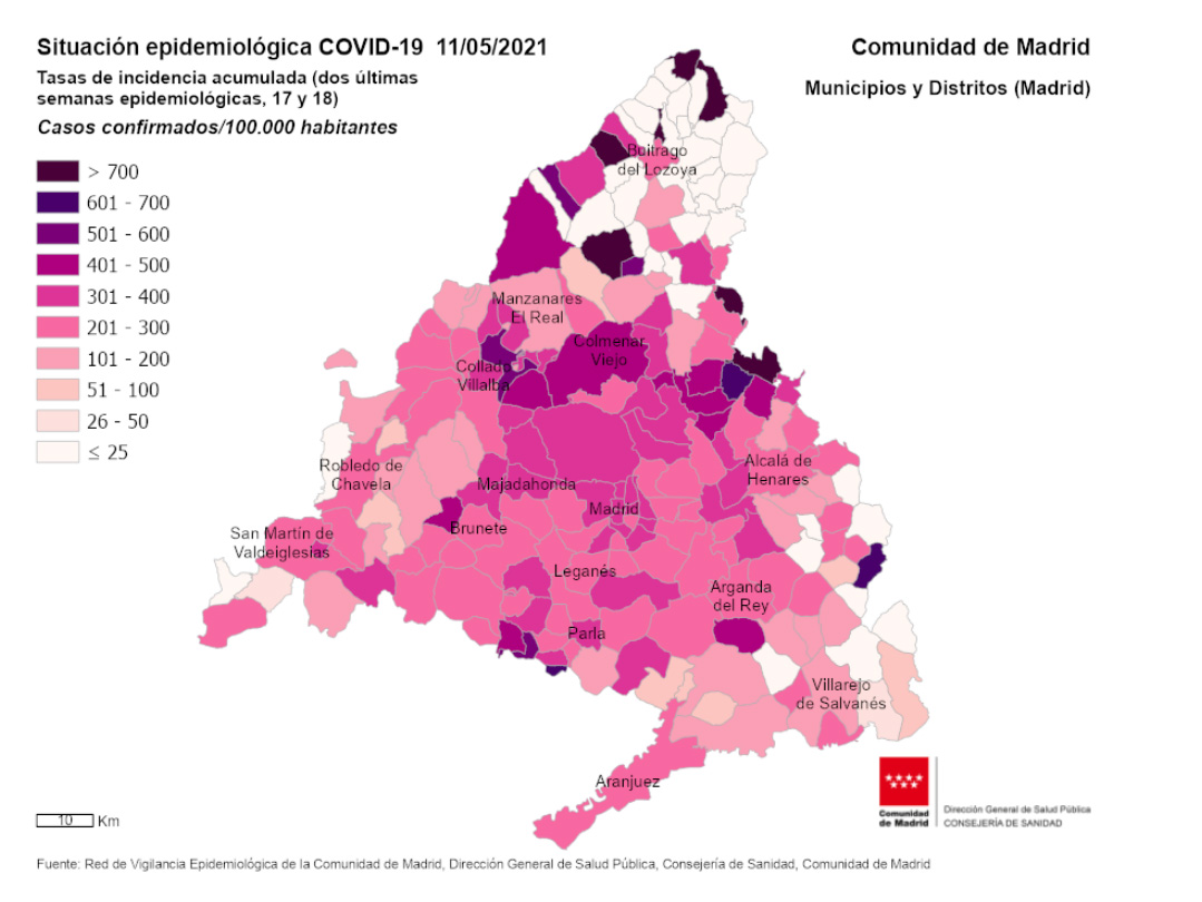 En cuanto a Leganés, la IA a 14 días es de 291 casos por 100.000 habitantes a 14 días. En la zona básica de salud de Leganés Norte siguen disparados los contagios, con 583 casos por 100.000 habitantes. No en vano desde el 10 de mayo tiene decretado el cierre perimetral.
