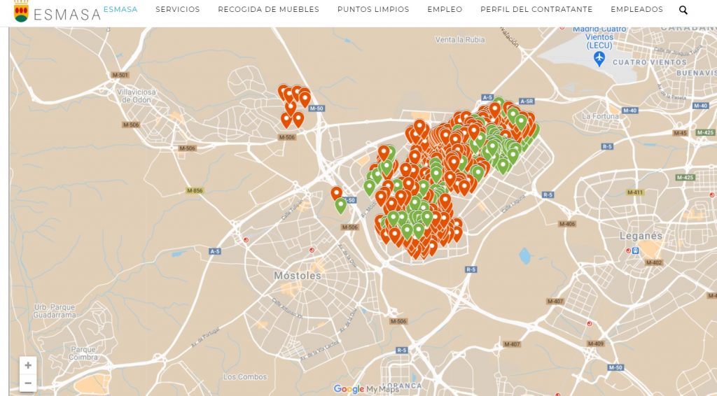 La empresa municipal de recogida de residuos de Alcorcón (ESMASA) ha elaborado un mapa que se va actualizando, y donde se informa a los vecinos de las islas ecológicas que empiezan a estar operativas para tirar la basura. Éstas están señalizadas en verde, y en rojo las que aún no funcionan.
