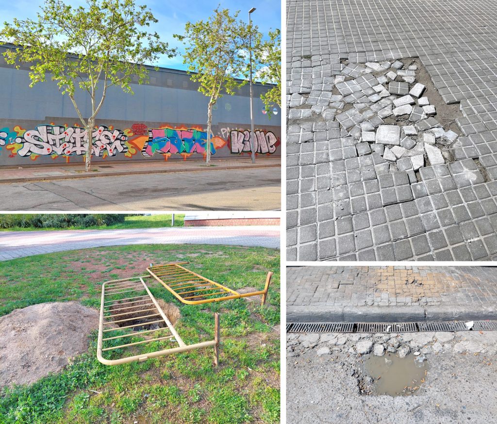 Desde muros y fachadas víctimas del vandalismo grafitero, a agujeros de alcorques vacíos y tapados con vallas oxidadas, pasando por baches en el asfalto y aceras levantadas, que no solo dejan una imagen paupérrima de estos barrios, sino que además suponen un peligro para los peatones.