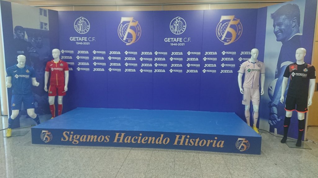La sala VIP del Coliseum ha servido este martes de escenario para la Gala presentación del 75 Aniversario del Getafe, que en primer lugar ha acogido la puesta de largo de las nuevas equipaciones oficiales, prendas que un año más siguen siendo suministradas por la firma Joma.