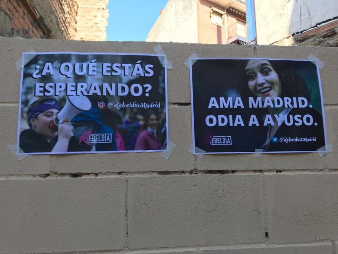 Firmados por el colectivo Rebeldía Madrid, éstos han colocado unos carteles en la popular calle Madrid, poco antes de llegar a la plaza del Ayuntamiento de Getafe, donde se puede leer ‘Ama Madrid. Odia a Ayuso’.