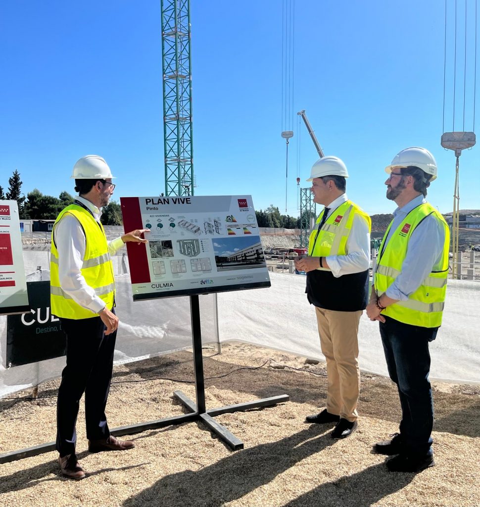 El alcalde de Pinto, Salomón Aguado, y el consejero de Vivienda, Jorge Rodrigo, han visitado el inicio de las 422 viviendas del Plan Vive de la Comunidad de Madrid en Pinto, ubicadas en el número 2 de la calle Isaac Albéniz número 2.