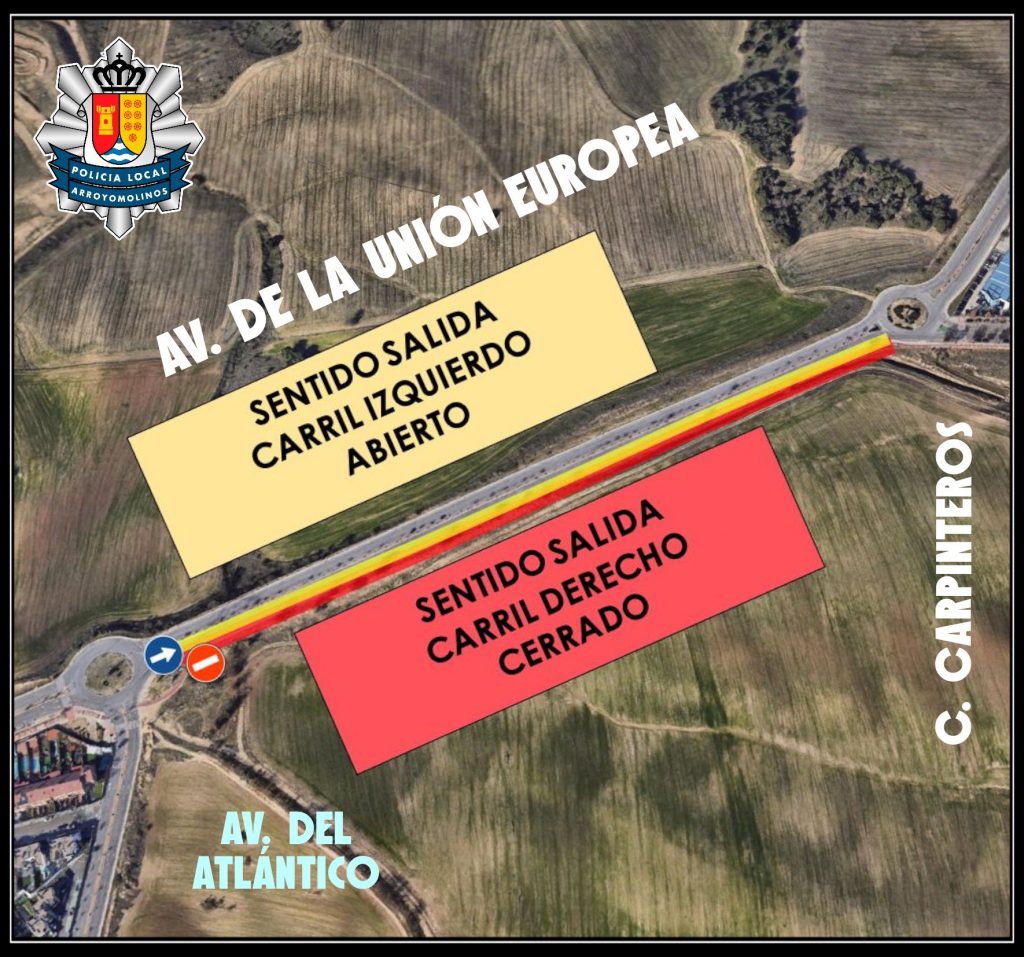 La Policía Local de Arroyomolinos ha informado que a partir de este miércoles, 29 de noviembre, se cortará al tráfico el carril derecho de salida de la avenida Unión Europea, por obras de mejora y reparación de la calzada. La circulación se reanudará una vez concluyan los trabajos, de los que no se ha especificado duración.