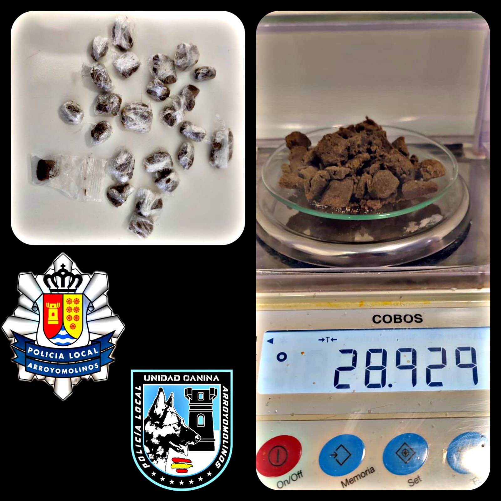 Agentes de la Unidad Canina de la Policía Local de Arroyomolinos han detenido a un joven, que portaba multitud de piedras de hachís. Se le acusa de un delito contra la salud pública.