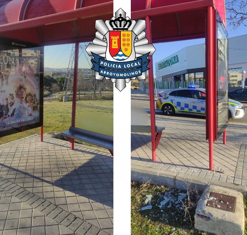 La Policía Local de Arroyomolinos ha identificado a un menor de edad como responsable del destrozo de una marquesina de la calle Algeciras.