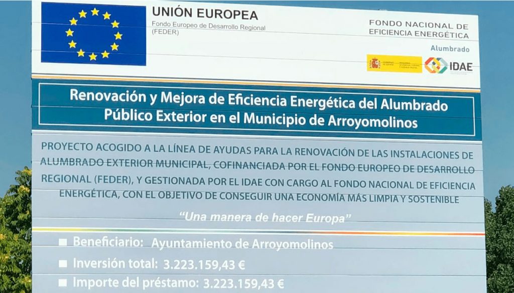 El inicio de la sustitución de las luminarias ha comenzado a mediados del mes de agosto. Se está realizando en turnos de 24 horas. La previsión del Consistorio es acabar estos trabajos de sustitución e implantación de tecnología LED a finales de 2018. La inversión para la implantación de la tecnología LED en Arroyomolinos alcanza los 3.223.000 euros, a través de un préstamo del IDAE, con Fondos FEDER de la Unión Europea.