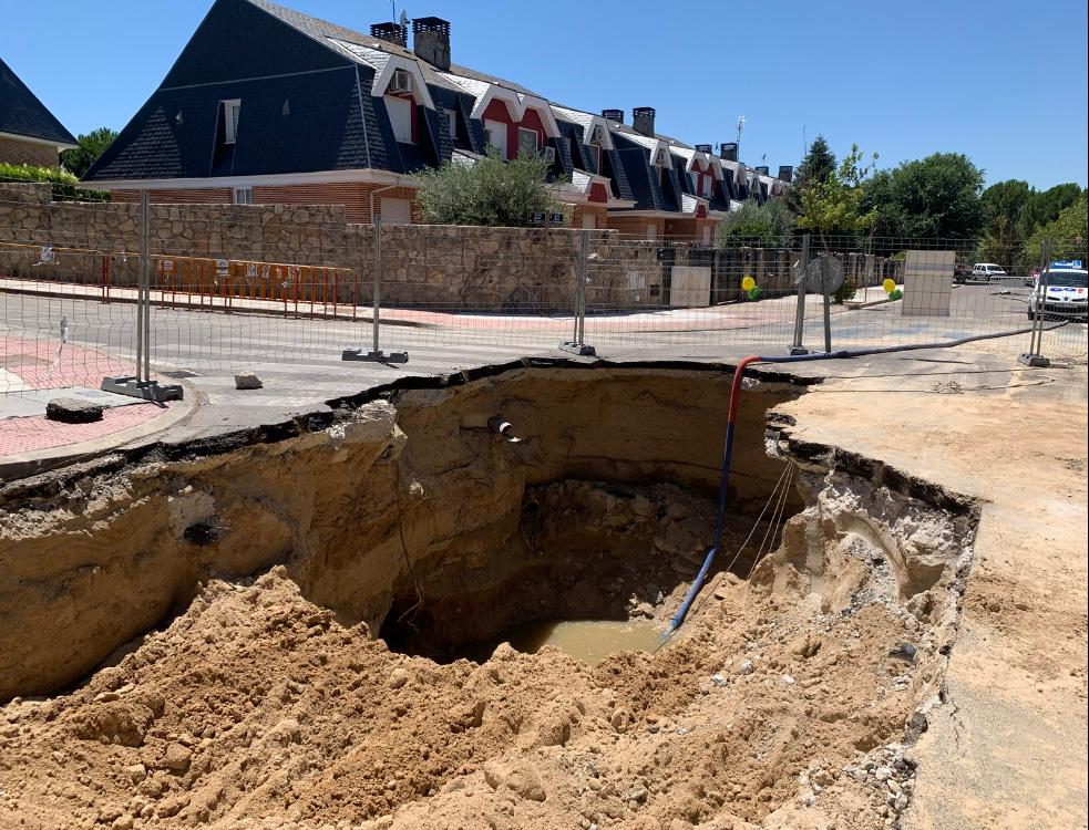 Una fuga de agua en la red de alcantarillado ha originado un enorme socavón en el cruce de las calles Sierra Guadarrama, con Sierra de Cazorla, en Arroyomolinos. Lo que ha provocado el cierre de ambas.