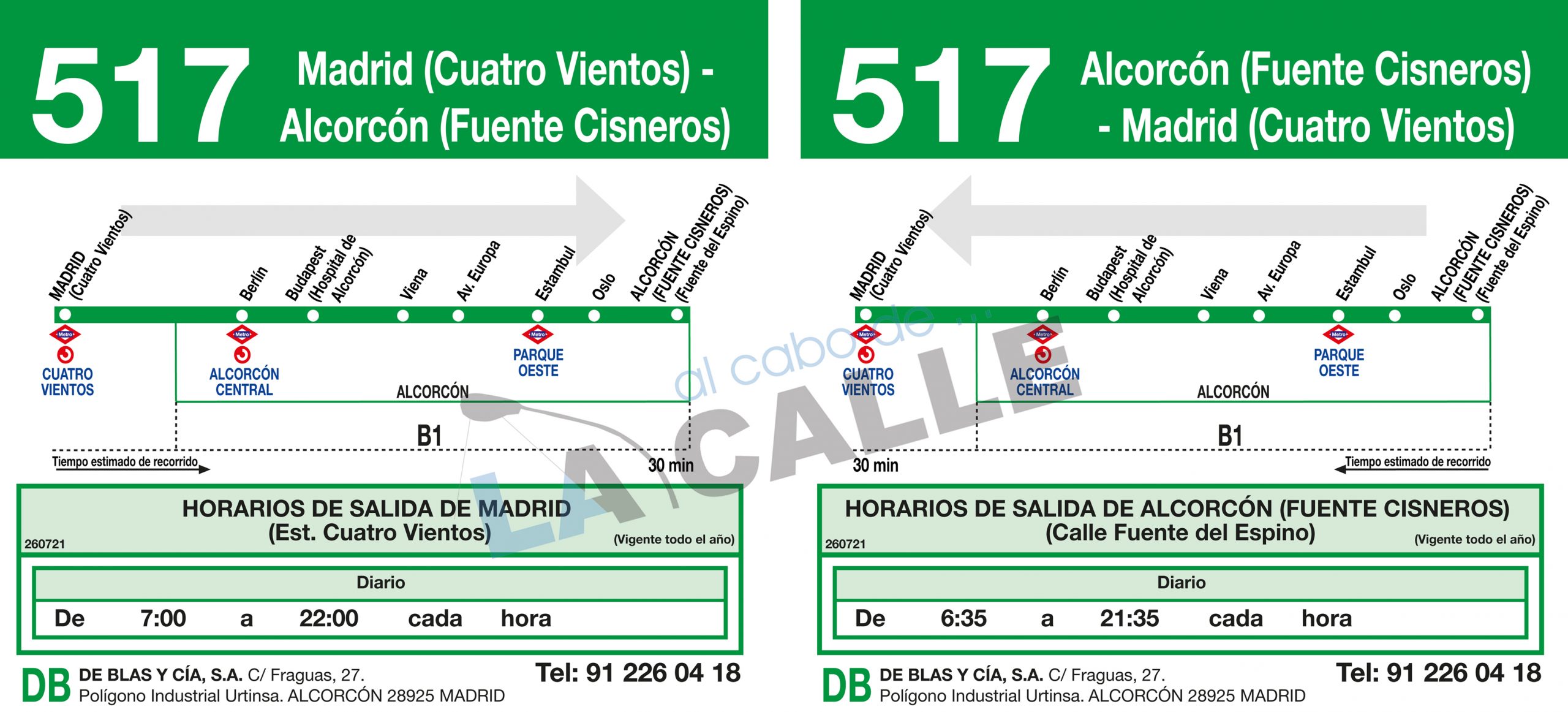 Con cabecera en Cuatro Vientos, este servicio de transporte, prestado por DeBlas/Arriva bajo la concesión VCM-501, realizará una expedición cada hora con salida desde las 07.00 horas de la mañana, hasta las 22.00 horas. En Fuente Cisneros –Alcorcón– el servicio se prestará desde las 06.35 horas de la mañana hasta 21.35 horas, con la misma frecuencia de paso, y recorriendo importantes núcleos comerciales, como el de Parque Oeste.