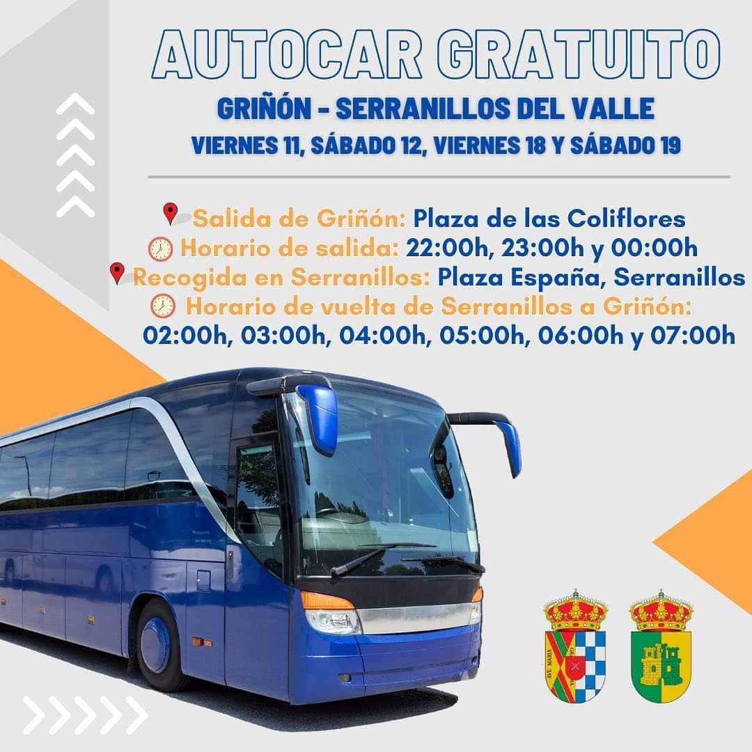 Los ayuntamientos de Griñón y Serranillos del Valle han acordado un año más facilitar autobuses gratuitos por la noche mientras duren las Fiestas Patronales de Serranillos del Valle.