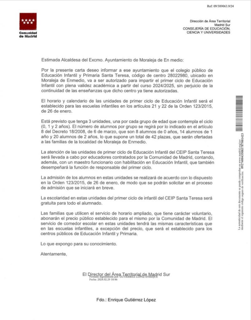Las peticiones realizadas por el Ayuntamiento de Moraleja de Enmedio, junto a las del CEIP Santa Teresa y de los padres de los alumnos del propio centro escolar, se han visto satisfechas por parte de la Consejería de Educación, Ciencia y Universidades de la Comunidad de Madrid, que en una carta remitida a la alcaldesa del municipio, Arantxa Alonso Godino, ha notificado que este centro va a ser autorizado para impartir el primer ciclo de Educación Infantil con plena validez académica, a partir del curso 2024/202, “sin perjuicio de las continuidad de las enseñanzas que dicho centro tiene ya autorizadas”.