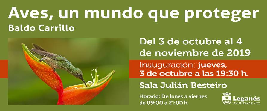 La sala Julián Besteiro de Leganés acoge la exposición fotográfica Aves, un mundo que proteger’, de Baldo Carrillo, a partir de este jueves, 3 de octubre a las 19.30 horas. La muestra podrá visitarse de lunes a viernes, de 9.00 a 21.00 horas, hasta el 4 de noviembre.