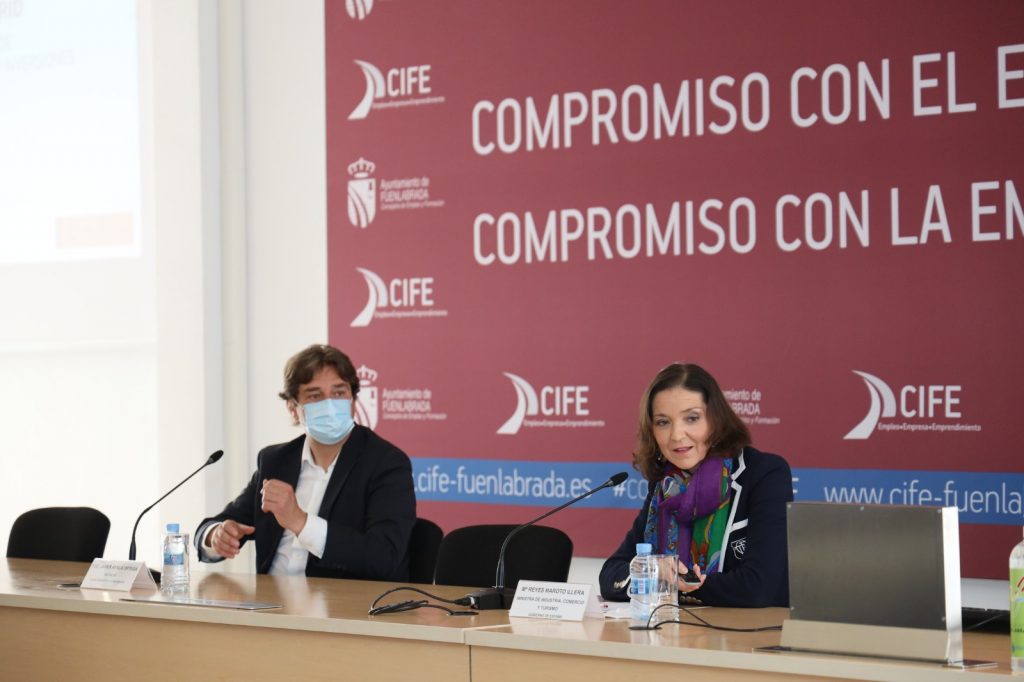 La ministra de Industria y Comercio, Reyes Maroto ha visitado este miércoles Fuenlabrada, acompañada por el alcalde, Javier Ayala, para interesarse por los proyectos económicos y empresariales que se están desarrollando en la ciudad.