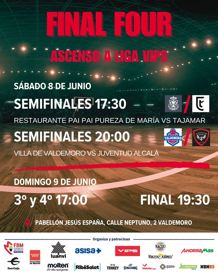 El pabellón Jesús España acogerá este fin de semana la Final a 4 que la Federación de Baloncesto de Madrid convoca para el ascenso a la Liga VIPS (Primera Nacional) y en la que el club local Villa de Valdemoro tendrá como rivales al Juventud Alcalá, al Restaurante Pai Pai Pureza de María y al Tajamar.