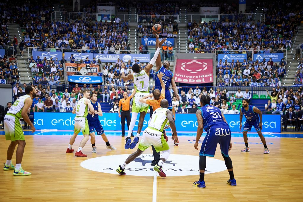 Salto inicial del partido entre el Burgos y el Urbas Fuenlabrada (ACB Photo)
