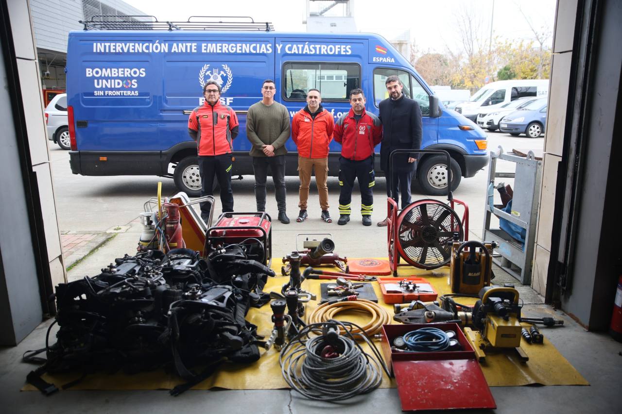 Entre el material entregado destacan varios generadores de luz, espalderas con reguladores imprescindibles para la respiración autónoma, kit de oxicorte, surtidores de agua y material diverso de rescate además de cojines de elevación neumáticos, destinados al Grupo de Intervención en Catástrofes (GIC) de Bomberos Unidos Sin Fronteras que