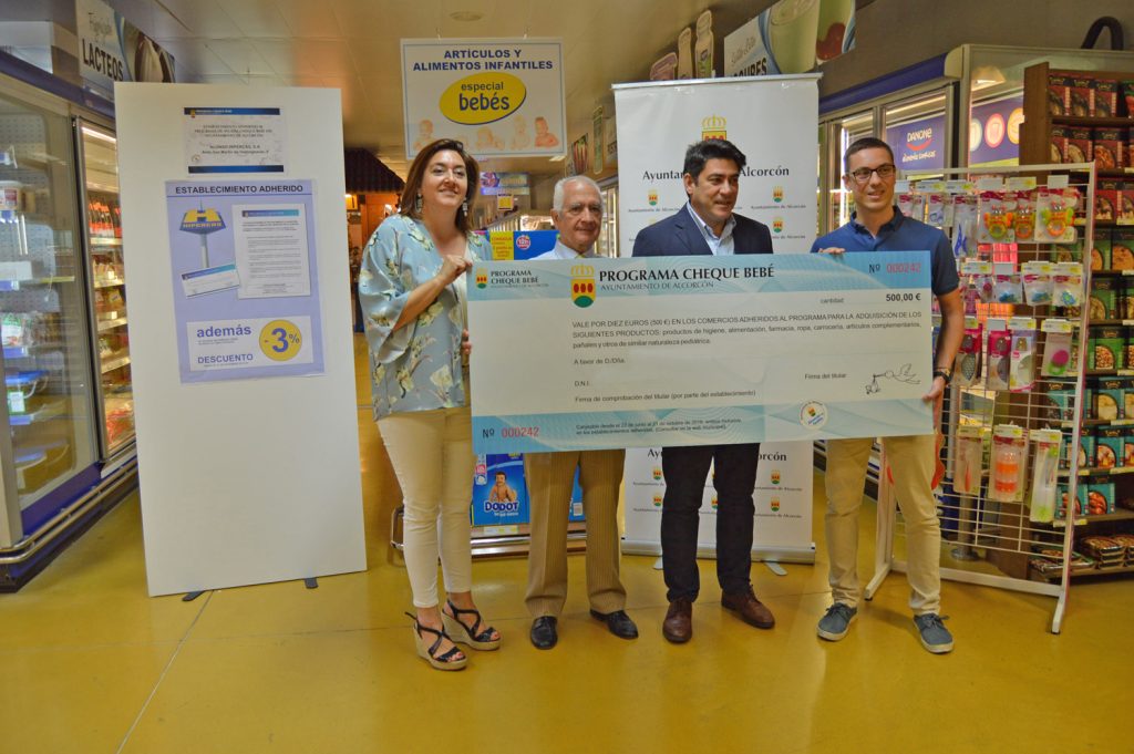 El alcalde de Alcorcón, David Pérez ha hecho entrega en un acto simbólico de dos cheques bebés a dos familias de la ciudad que se han beneficiado de esta ayuda, recibida ya por casi 1.500 familias alfareras. El acto ha tenido lugar en Alonso Hipercas, establecimiento adherido a esta campaña, y también han estado presentes su presidente Juan Alonso, y Juan José Atienza, responsable de la Farmacia Juan José Atienza, acompañado de la segunda teniente de alcalde y concejal del área Social, Susana Mozo.