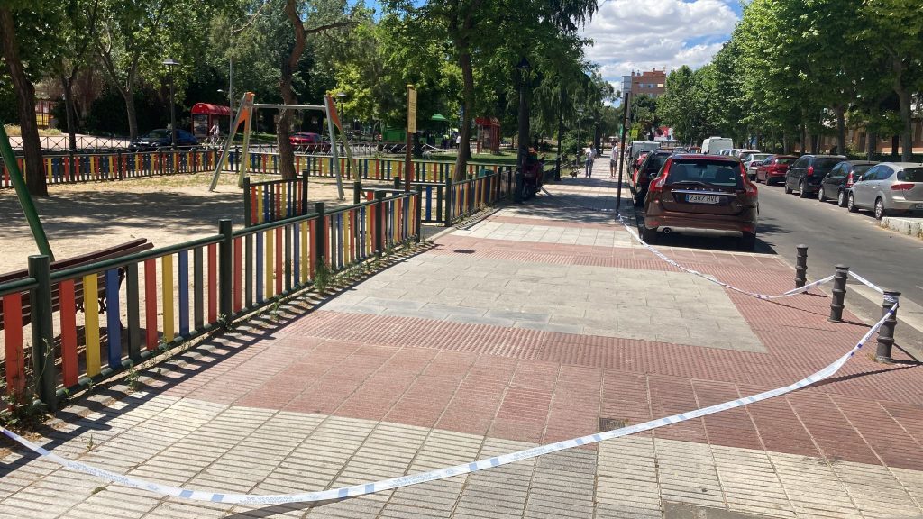 Con un cordón policial. Así se ha precintado el parque infantil de la avenida de Leganés en Alcorcón, junto al Metro de Parque de Lisboa, por la presencia de una plaga de garrapatas.