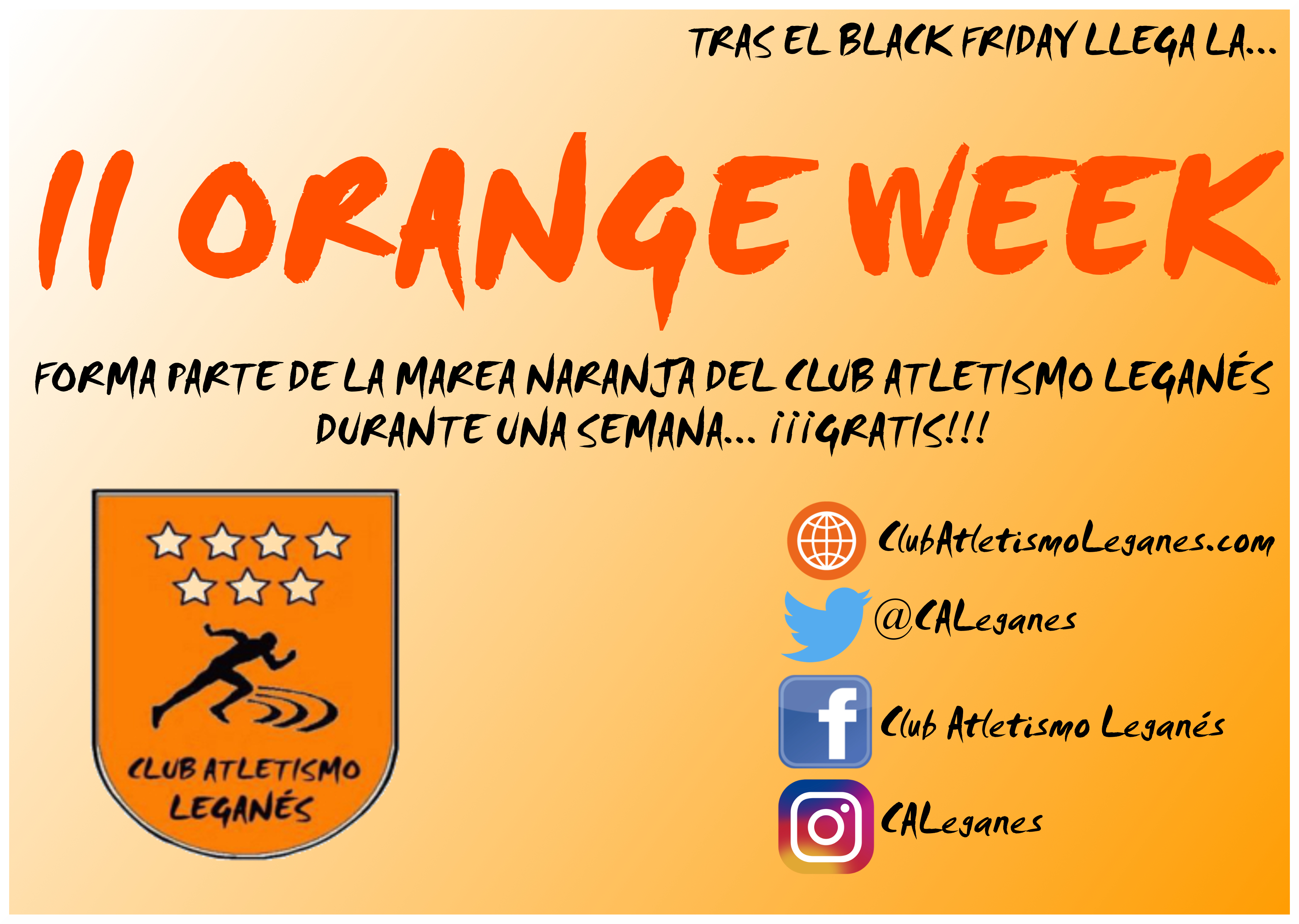 Tras la buena experiencia de la primera edición, el Club Atletismo Leganés vuelve a  aprovechar la celebración del Black Friday para poner en marcha su II Orange Week, una promoción muy especial que permitirá a toda aquella persona que lo desee disfrutar de una semana de entrenamientos de manera totalmente gratuita y sin ningún tipo de compromiso.
