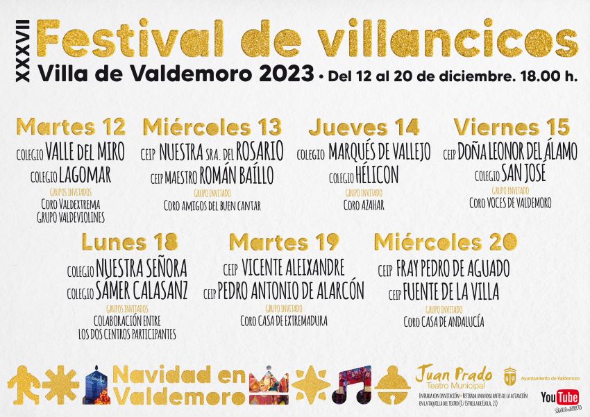 El Teatro Municipal Juan Prado acoge desde hoy, y hasta el 20 de diciembre, el XXXVII Festival de Villancicos Villa de Valdemoro. En esta edición, en la que participan 21 grupos corales, se incluyen las actuaciones que cinco coros y asociaciones locales realizarán en la plaza de la Constitución.