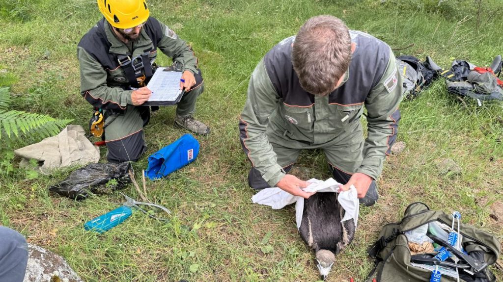 Durante el mes de junio, los agentes forestales ascienden hasta los nidos para recoger a los pollos, de alrededor de cinco kilos de peso. Desde allí los bajan al suelo en una bolsa especial para su traslado.