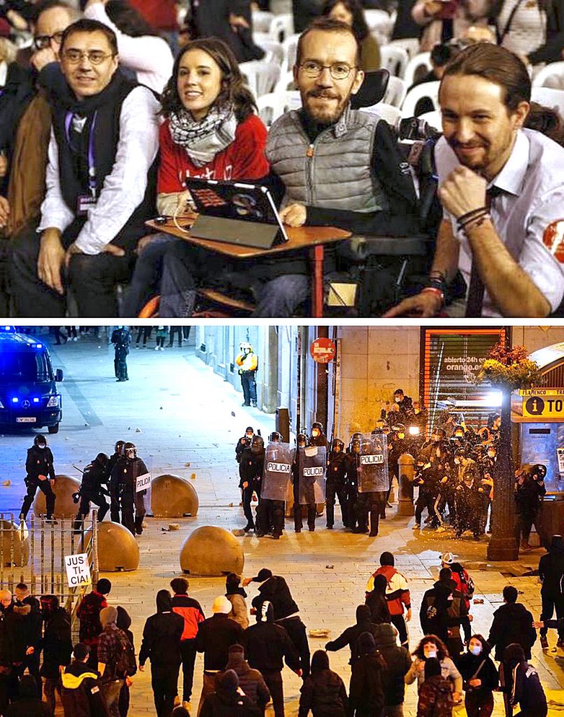 El portavoz de Podemos, Pablo Echenique, azuzaba anoche a la masa violenta en Madrid, al grito de la lucha de la clase obrera. Qué paradoja que gentuza que no ha dado palo al agua en su vida, amedrente a trabajadores refugiados en las tiendas por el lanzamiento de piedras. Otra paradoja es que desde un partido de Gobierno se alienten manifestaciones contra un sistema que les ha dado la posibilidad de gobernar.