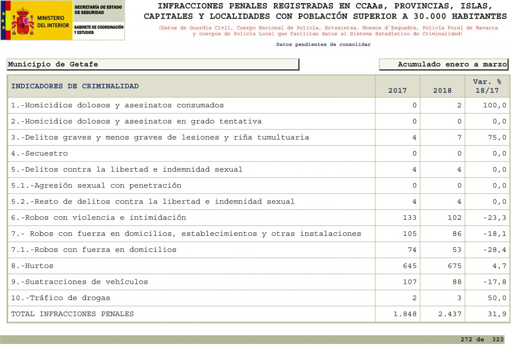 De esos cuatro tipos delictivos, el Ministerio saca un total de indicadores principales que son los que aparecen en la tabla publicada en su página web. Y para completar las infracciones totales, Interior suma “otras infracciones penales no contempladas en los puntos anteriores”, más “total de delitos y faltas conocidas por las Fuerzas y Cuerpos de Seguridad del Estado”, que darían como resultado las infracciones finales que, en el caso de Getafe, supondrían un aumento del 31,9% en cuanto a las cifras manejadas por el departamento que dirige Juan Ignacio Zoido.