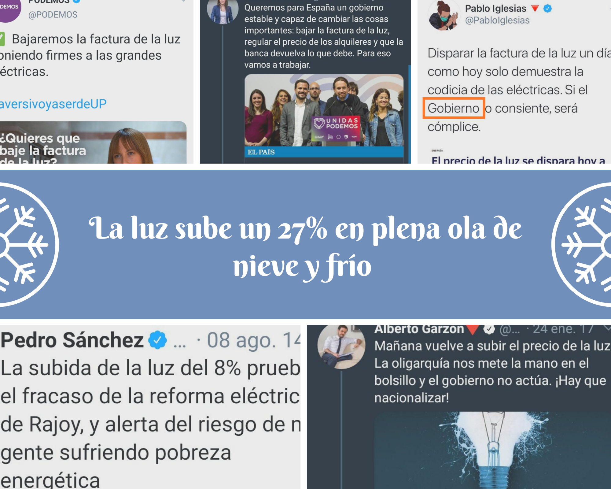 «Disparar la factura de la luz un día como hoy solo demuestra la codicia de las eléctricas. Si el Gobierno lo consiente será cómplice», Pablo Iglesias Turrión, secretario general de Podemos, 18 de enero de 2017. A 8 de enero de 2021 es el vicepresidente segundo del Gobierno, y ministro de Derechos Sociales y Agenda 2030.