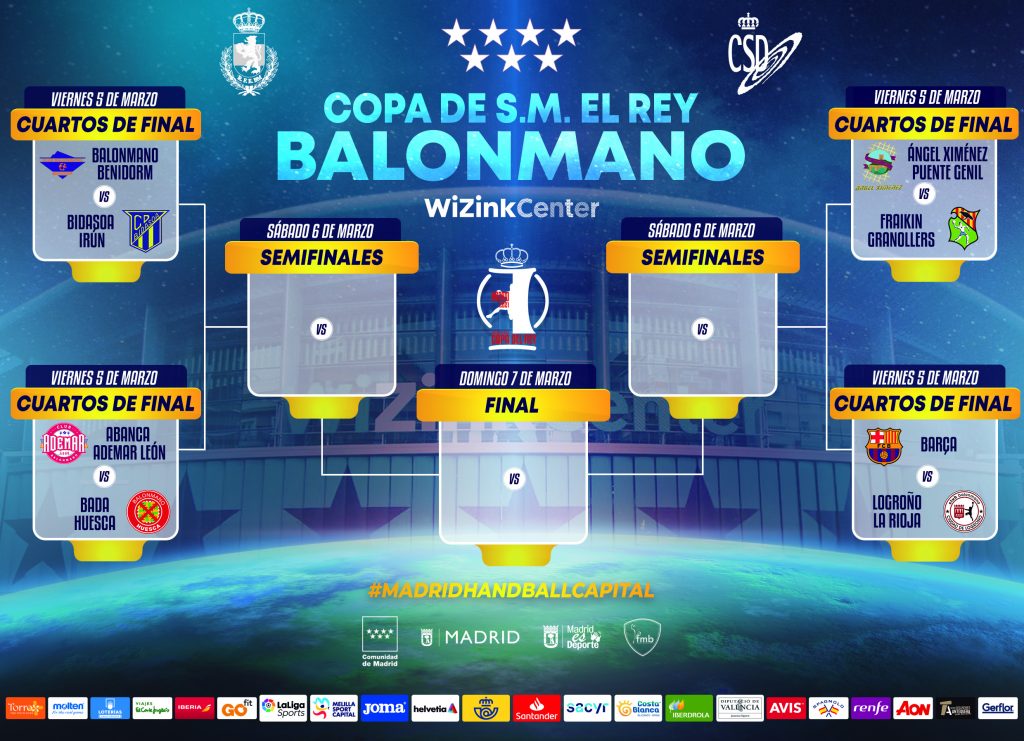 Este jueves ha tenido lugar el sorteo de la fase final de la XLVI Copa de S. M. El Rey que tendrá lugar del 5 al 7 de marzo en el WiZink Center de Madrid. Participan ocho equipos y el sorteo de cuartos de final ha deparado los siguientes emparejamientos: