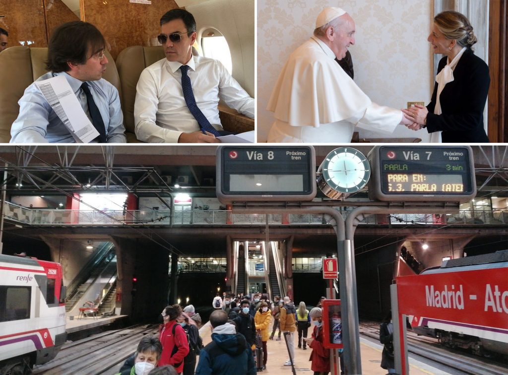 Mientras aguardaba pacientemente y buscaba información del organismo público sobre la incidencia (megafonía no funcionaba), leía que la muy obrera ministra Yolanda Díaz (la inteligente de Podemos) había utilizada el Falcon para entrevistarse en audiencia privada con el ‘Papa diabólico’. Y que solo en un mes, su ‘Sanchidad’ lo había usado 54 veces para ir a actos del PSOE.