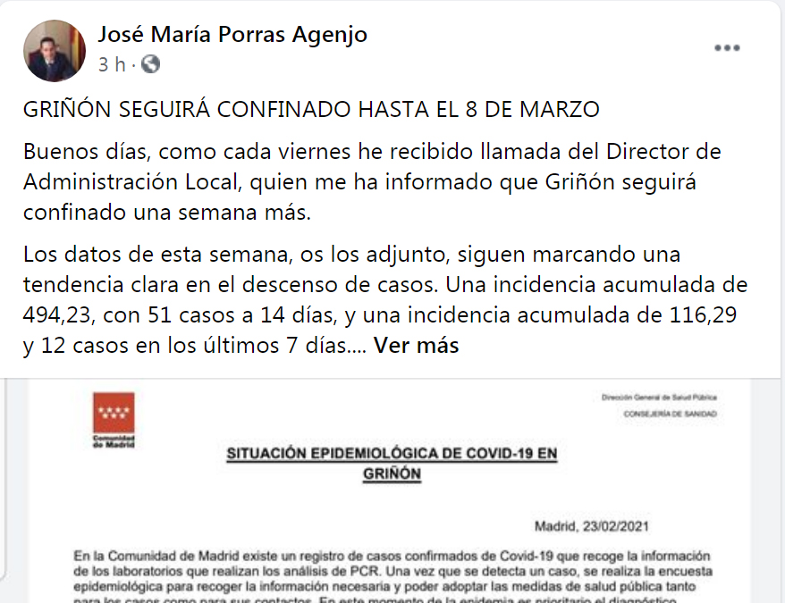 Porras había anunciado en su perfil de Facebook que de acuerdo a una llamada del director de Administración Local de la Comunidad de Madrid el municipio quedaba cerrado por coronavirus una semana más. Información que ha sido negada por la Comunidad. Por tanto, las restricciones en Griñón se levantan el 1 de marzo.