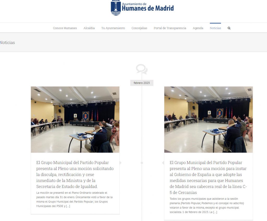 Así, en los últimos días y tras la celebración del Pleno ordinario, la web municipal recogía la aprobación de dos mociones presentadas por el Partido Popular, pidiendo el cese de la ministra de Igualdad y la secretaria de Estado contra la violencia de género, por la aberrante Ley solo sí es sí. Al mismo tiempo, informaba de haber solicitado al Ministerio de Transportes, que Humanes de Madrid sea cabecera real de la C-5 de Cercanías.