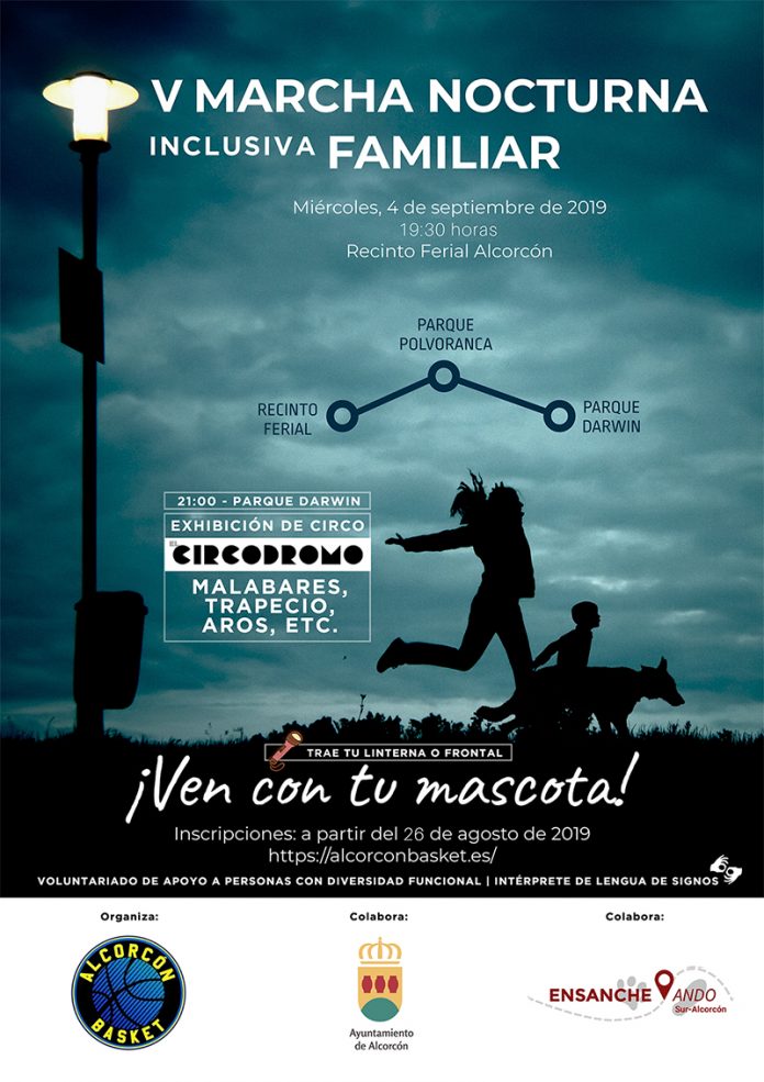 Uno de los eventos más singulares que incluyen las fiestas patronales de Alcorcón es la Marcha nocturna inclusiva familiar, que alcanza su quinta edición y que se celebra este miércoles a partir de las 19.30 horas con salida en la caseta del Alcorcón Basket en el recinto ferial. Desde ahí los participantes emprenderán un recorrido hasta el parque Polvoranca para posteriormente trasladarse hasta el parque Darwin.