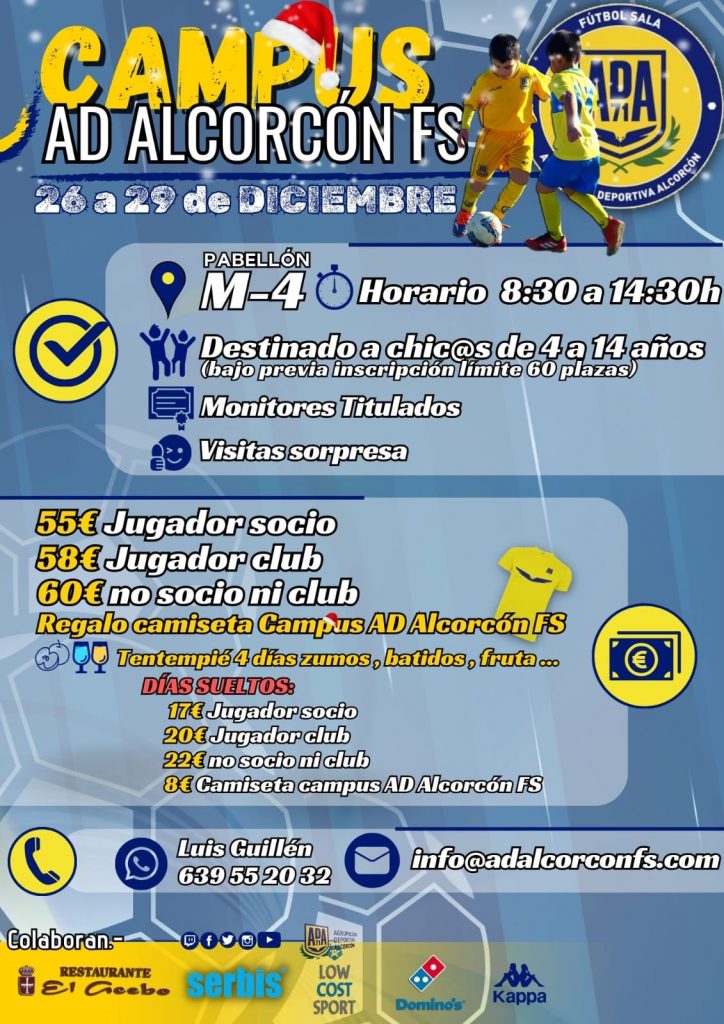 El Alcorcón FS organizará un campus navideño de fútbol sala coincidiendo con el período vacacional. Tendrá lugar en las instalaciones del pabellón M4 María José Calero del 26 al 29 de diciembre en horario de 8:30 a 14:30 horas.