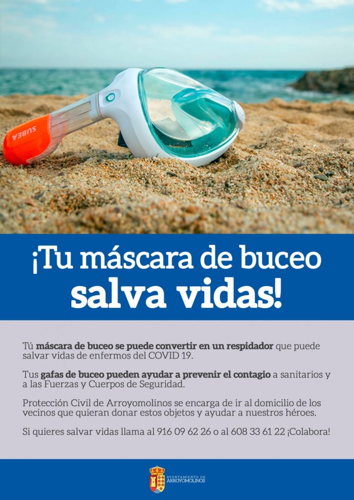 «Tu máscara de buceo salva vidas». Ese es el lema que ha utilizado el Ayuntamiento de Arroyomolinos para pedir a sus vecinos que donen su mascarillas y gafas de buceo «para ayudar a que se puedan usar como respiradores para los afectados de coronavirus«.