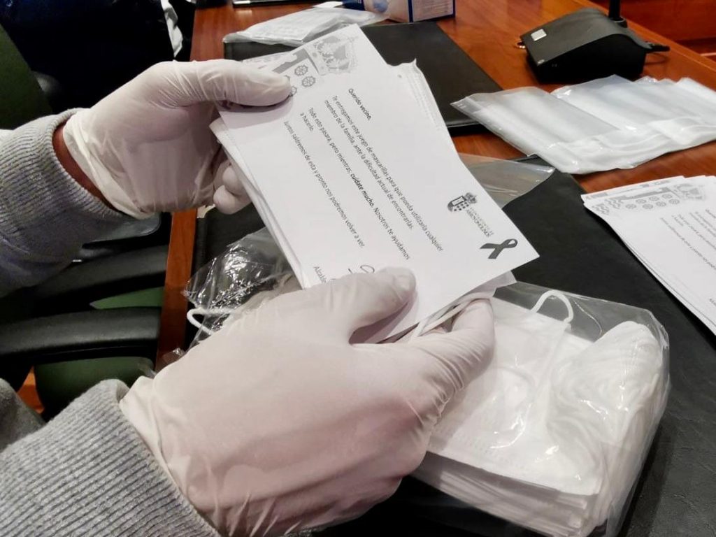 El Ayuntamiento de Arroyomolinos ha empezado a repartir, este jueves 23 de abril, mascarillas en los 11.152 domicilios que hay en el municipio. Conserjes y auxiliares municipales, de forma voluntaria, empaquetan las mascarillas, mientras que Policía Local, voluntarios de Protección Civil, monitores de Ocio y Tiempo Libre, personal de Deportes y Mantenimiento hacen las entregan en los hogares.