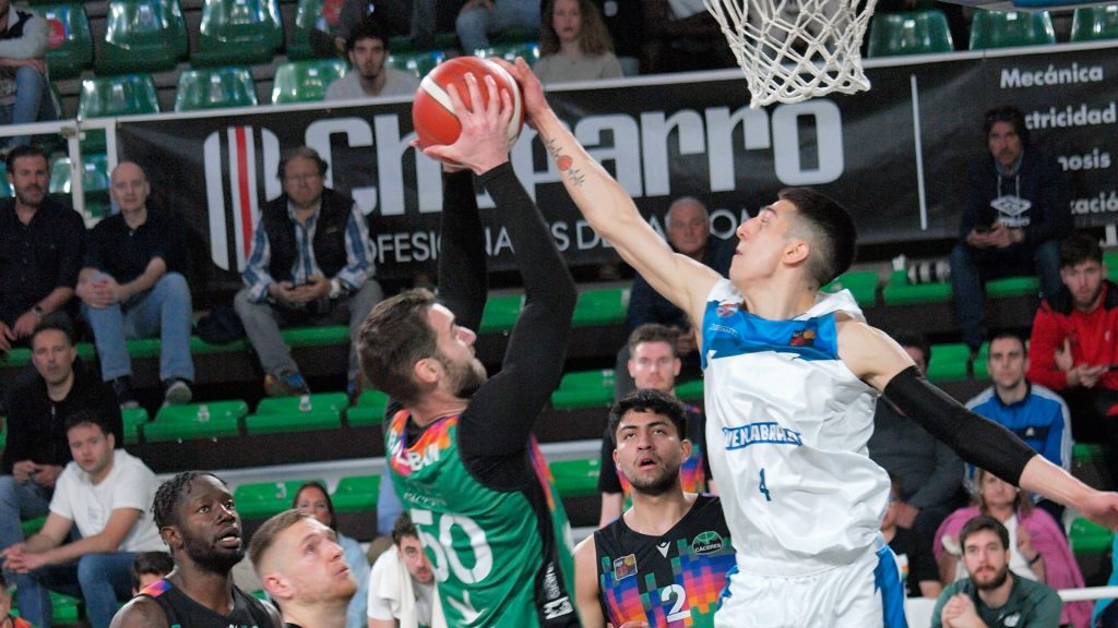 Espectacular tapón de Mateo Díaz sobre un jugador del Cáceres (foto: Cáceres Baloncesto)