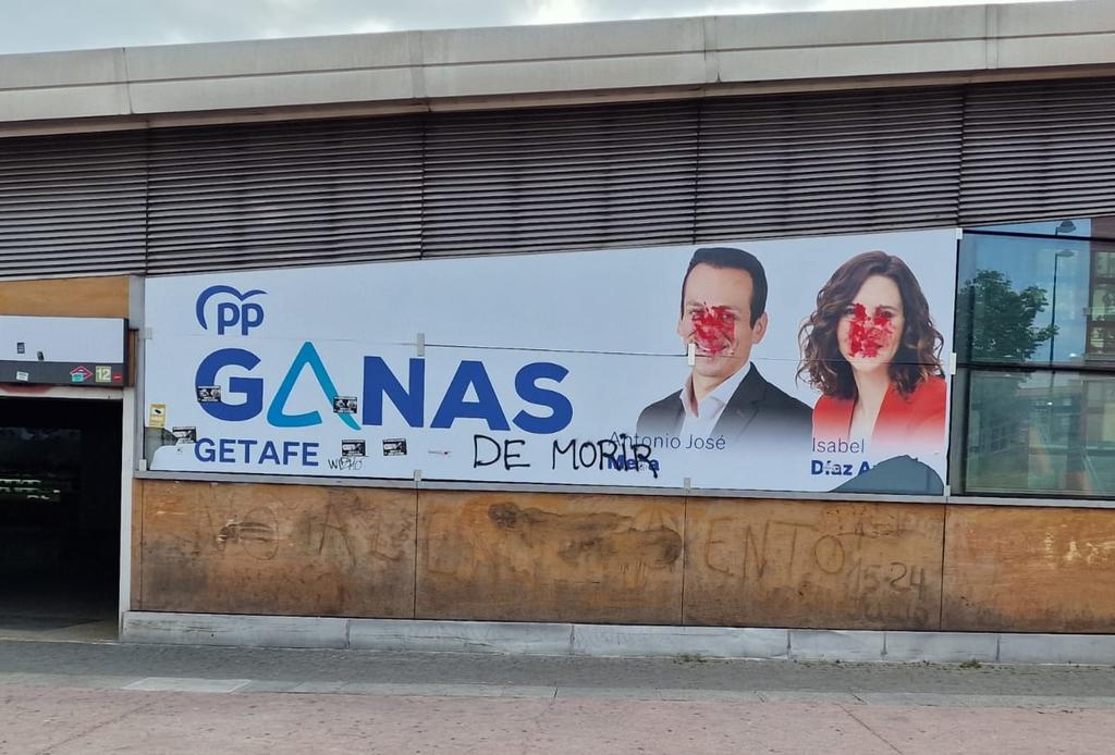Los carteles electorales del Partido Popular en Getafe Central han sido nuevamente vandalizados, con pintadas insultantes hacia el candidato local, Antonio José Mesa, y la candidata regional, Isabel Díaz Ayuso.