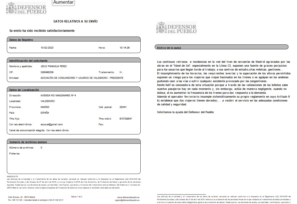 La Asociación de Consumidores y Usuarios de Valdemoro (Acusval) ha elevado una queja al Defensor del Pueblo reclamando su intervención ante la situación de colapso en la red de Cercanías en la Comunidad de Madrid, agravada por las obras en el Túnel de Sol y que afecta especialmente a los usuarios de las líneas C-3 y C-4.