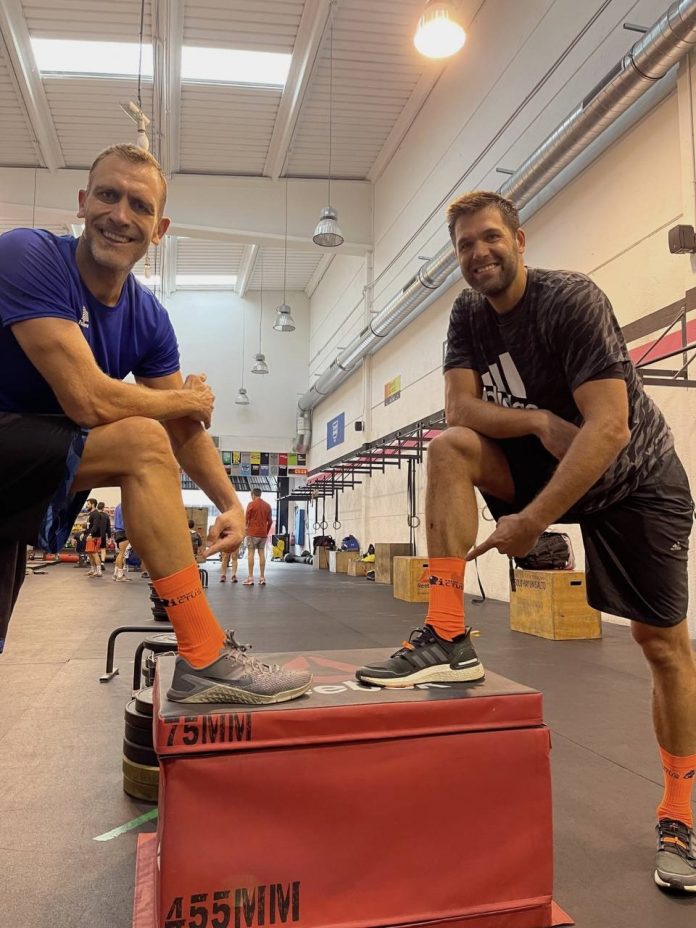Iñaki de Miguel y Felipe Reyes posan con los calcetines solidarios contra el ictus